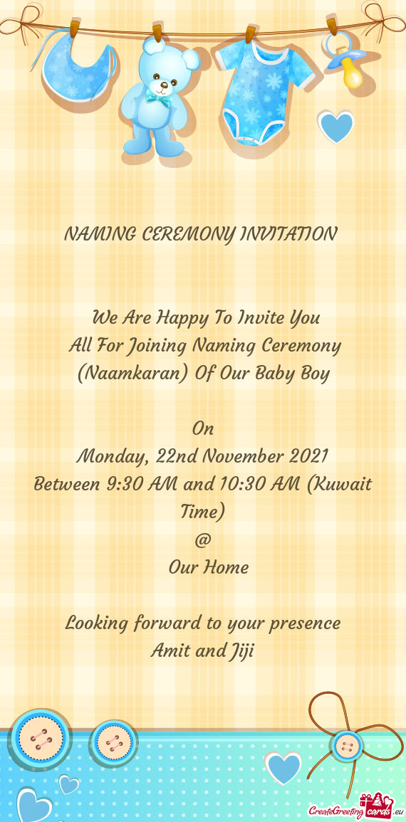 We solicit your presence at the cradling ceremony of our grandson.