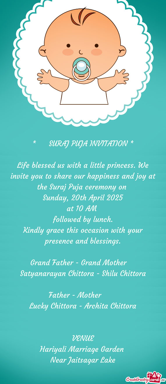 We are Happy to invite you all for joining the Chhathi Ceremony of our beloved baby boy