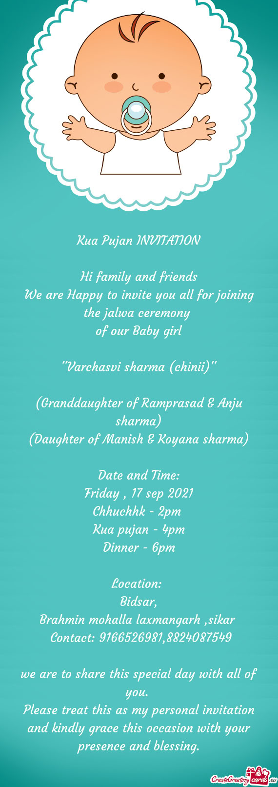 We are Happy to invite you all for joining the Chhathi Ceremony of our beloved baby boy Chhathi on