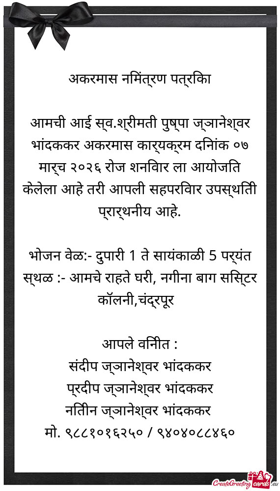 आपल्या सर्वास विनंती आहे की राहत्या घरी येऊन श्रद्धांजली अर्पण करणे ।