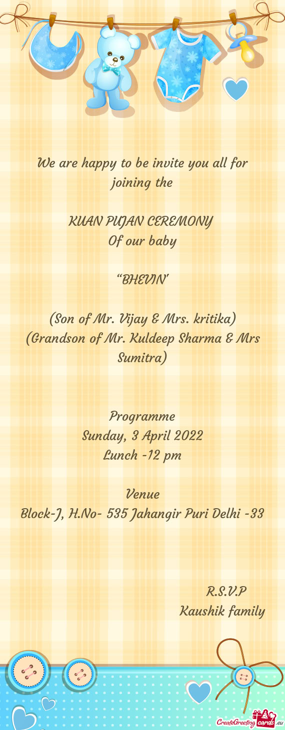 We are happy to invite you for joining the Sataisa Ceremony of our son beloved baby Shivansh Kumar