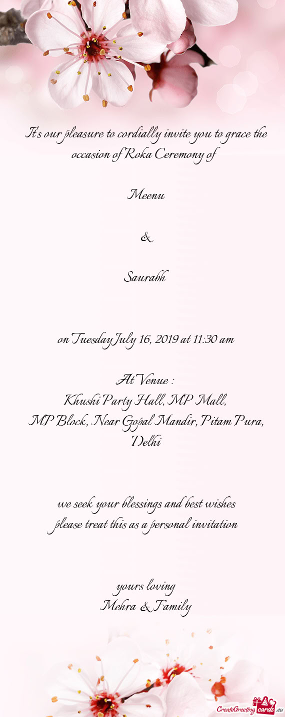 It is our pleasure to cordially invite you to grace the ocassion of Roka Ceremony of