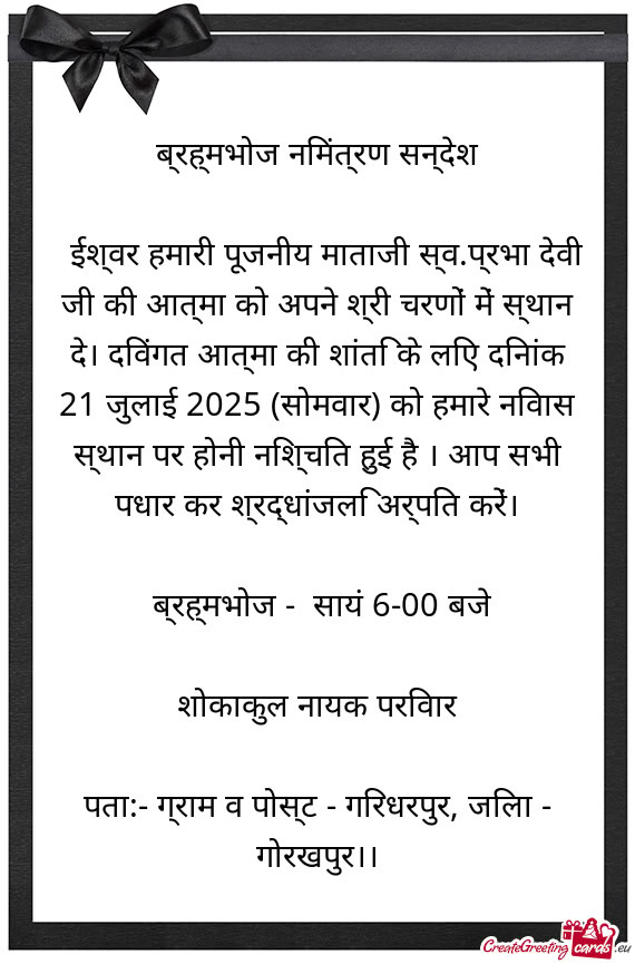 For the eternal peace of the departed soul Late Mrs.Aruna Bansal we will perform her barsi on 20th February, 2022(Sunday), at her residence, D-133 Kamla nagar Delhi-110007. We request your kind presence to grace this occasion.