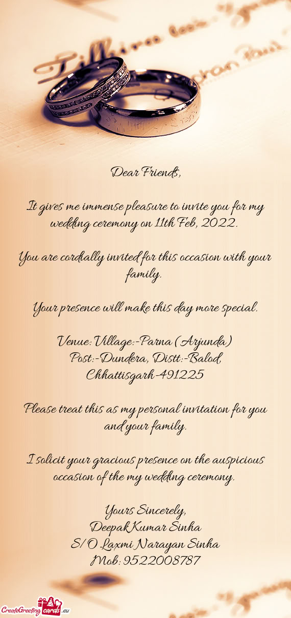 Please treat this as my personal invitation and join us to make our golden moments precious by your charming presence