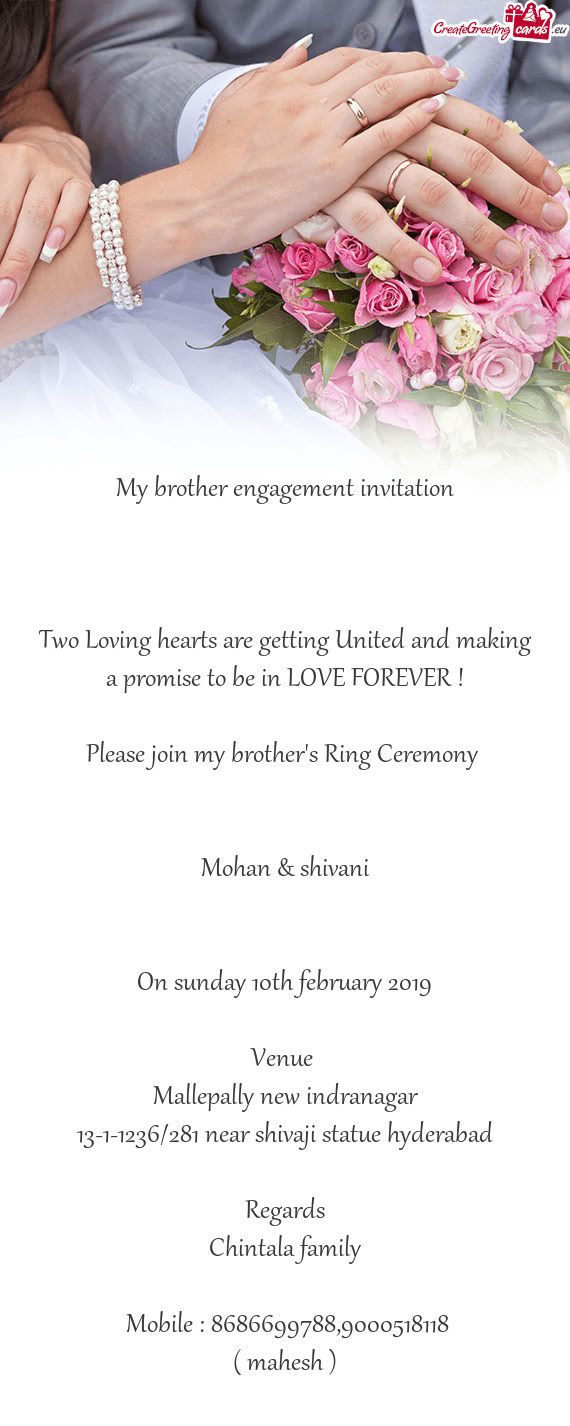 It gives me immense pleasure to cordially Invite you and your family on the auspicious occasion of my brother's marriage