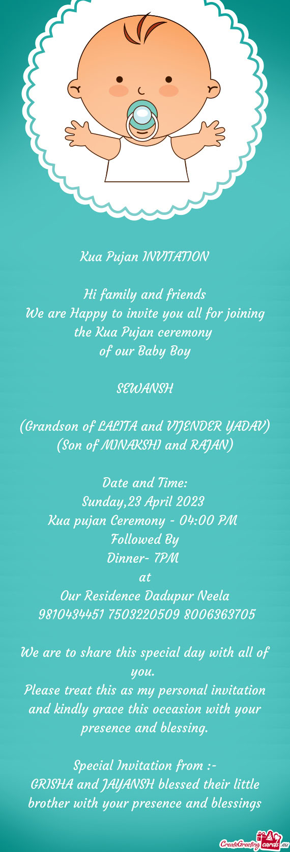 Please treat this as our personal invitation and kindly grace this occasion with your presence and shower your blessings.