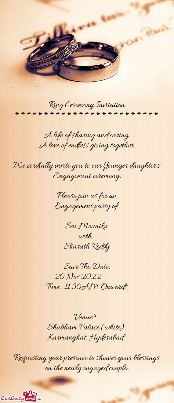 It's my pleasure to invite you and your family for joining the Engagement Party.