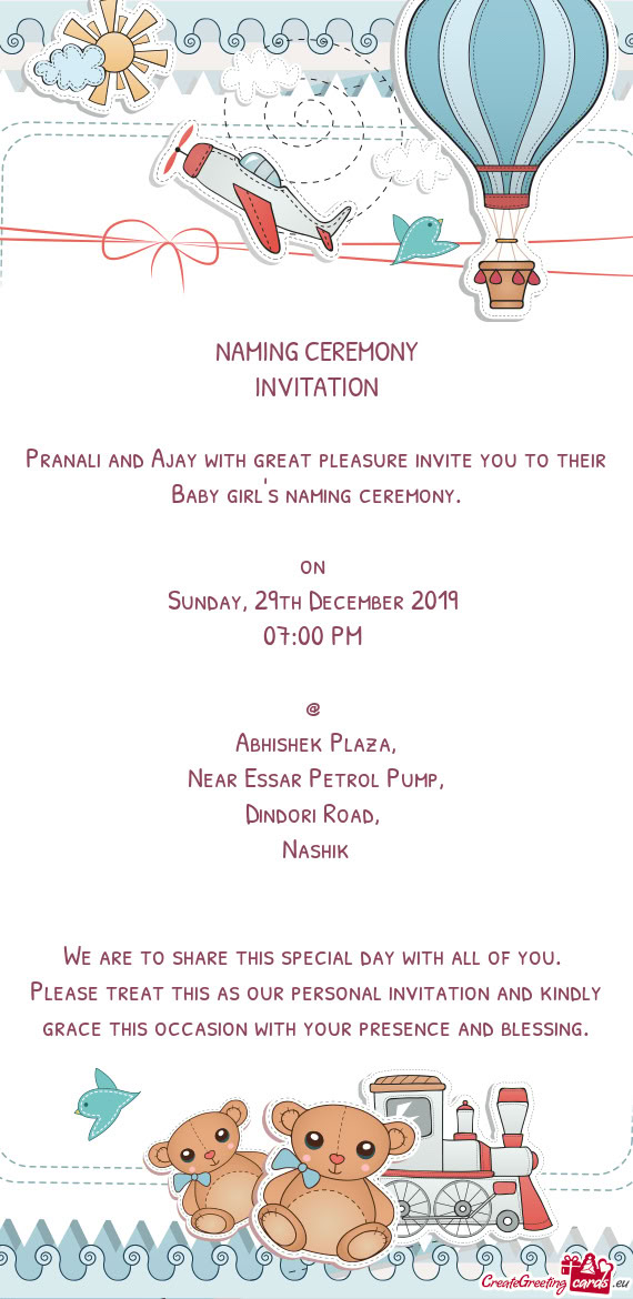 Please treat this as our personal invitation and kindly grace this occasion with your presence and blessing.
