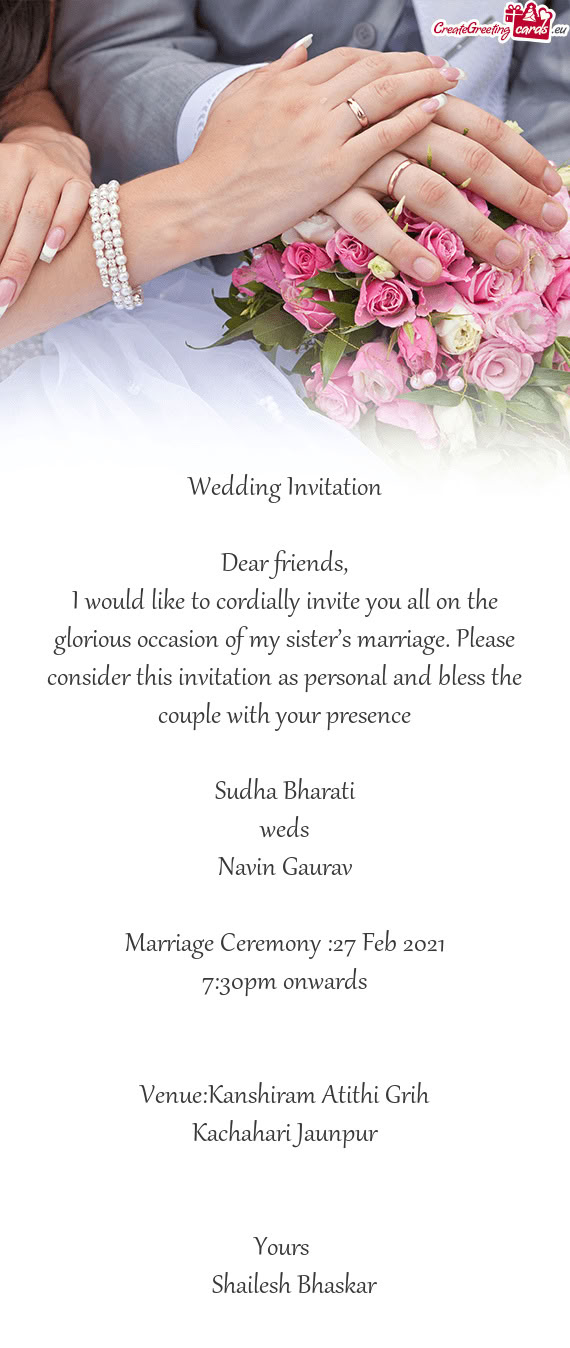 Please treat this as my personal invitation and join us to make our golden moments precious by your charming presence
