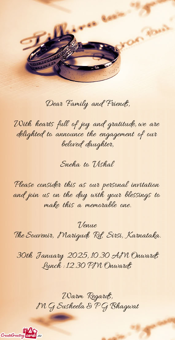It gives me immense pleasure to invite you for my wedding ceremony on 19th September,2018 at 11:30 A