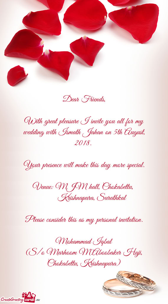 Its my immense pleasure to invite you with your family to attend my niece's wedding ceremony