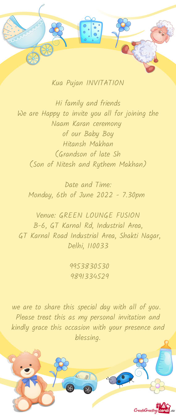 Please treat this as my personal invitation and kindly grace this occasion with your presence and blessing.