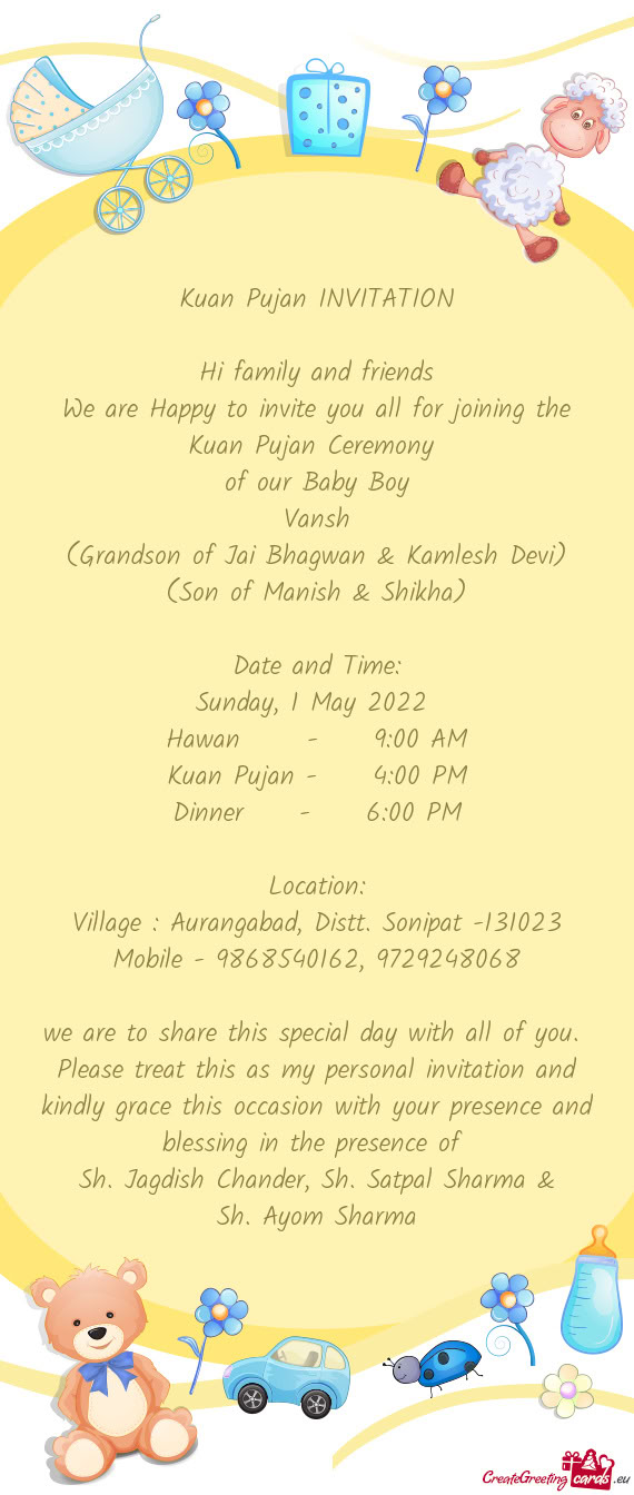 We are Happy to invite you all for joining the Kuan Pujan ceremony