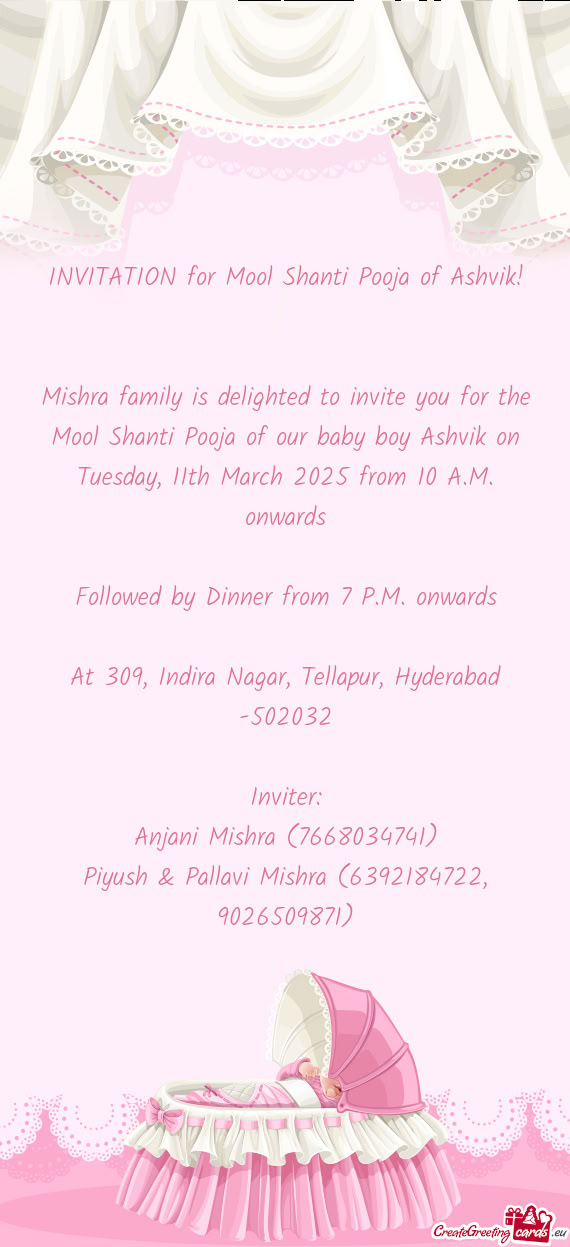 Please treat this as our personal invitation and kindly grace this occasion with your presence and blessing.