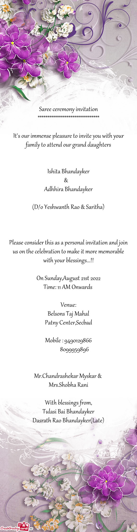We cordially invite you all to be a part of this exuberant morning of Prabhat pheri ceremony. Will be held at Our Residence . So You all are requested to please come