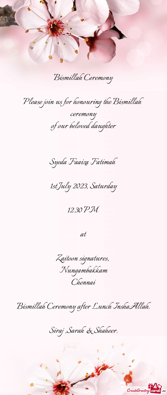 We request the pleasure of your company on the auspicious occasion of the Bangle Ceremony of