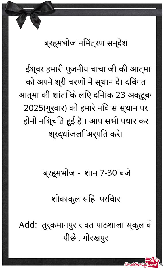 For the eternal peace of the departed soul we will perform his Prayer Meet on 12Th August 2023 (Saturday)from 4:00 PM to 5:00 PM at Arya Samaj Mandir, Green Park New Delhi 16