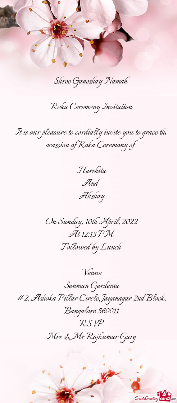 We request the pleasure of your company on the auspicious occasion of the “poo vaithal” Ceremony of