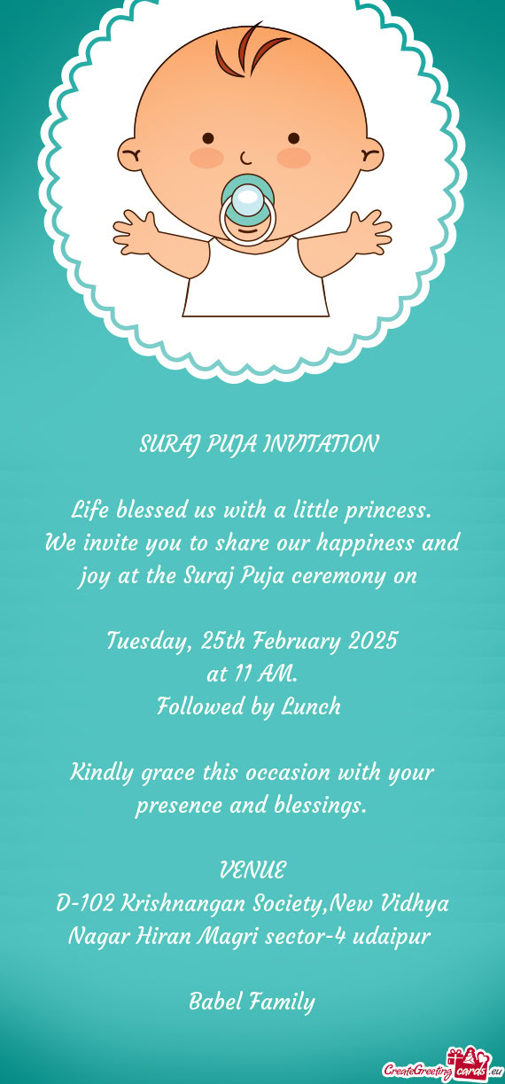 Please treat this as my personal invitation and kindly grace this occasion with your presence and blessing.