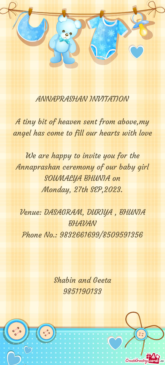 We are happy to invite you for the Annaprashan ceremony of our baby boy