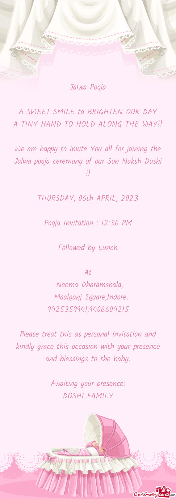 Please treat this as our personal invitaion and kindly grace this occasion with your presence and blessings.