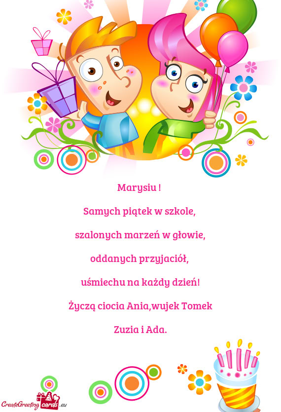Życzy: Ciocia Renata, wujek z z Kacprem Dominiką i Adrianem
