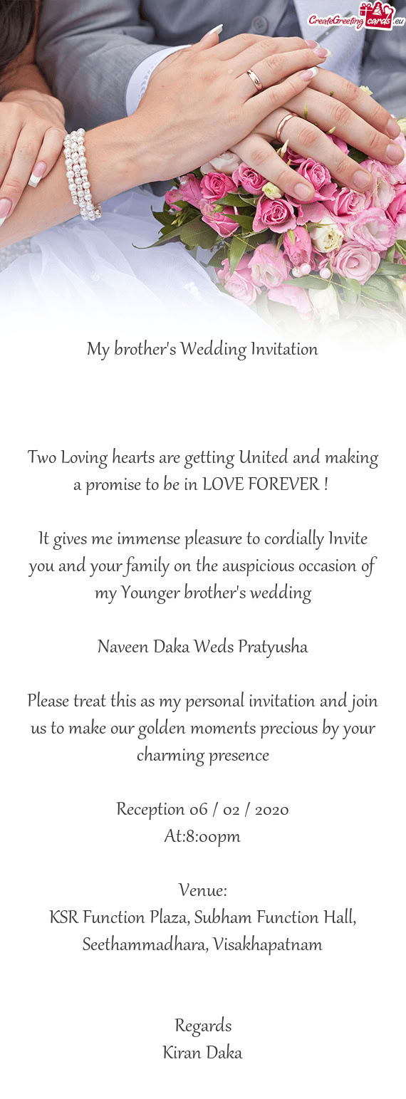 It gives me immense pleasure to cordially Invite you and your family on the auspicious occasion of my elder brother's marriage reception