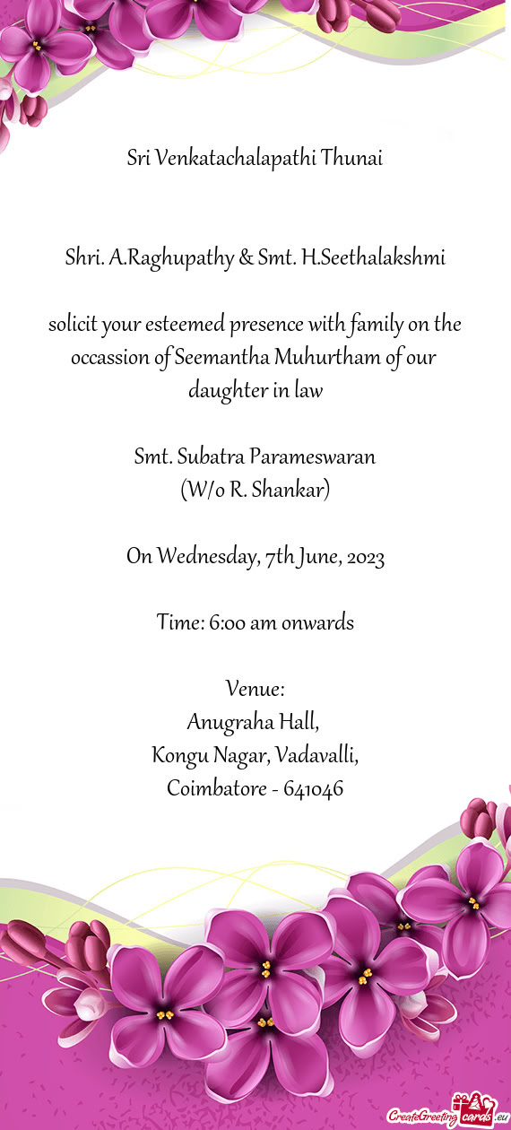 "BBD R&R function and Sneh-Bhojan"Valaikappu Seemantham(Baby shower) InvitationSounds of laughter, the feeling of love and loads of good healthDelan Newman familyMR & Mrs .Ganeshan NilaniANSHUMAN Sharma