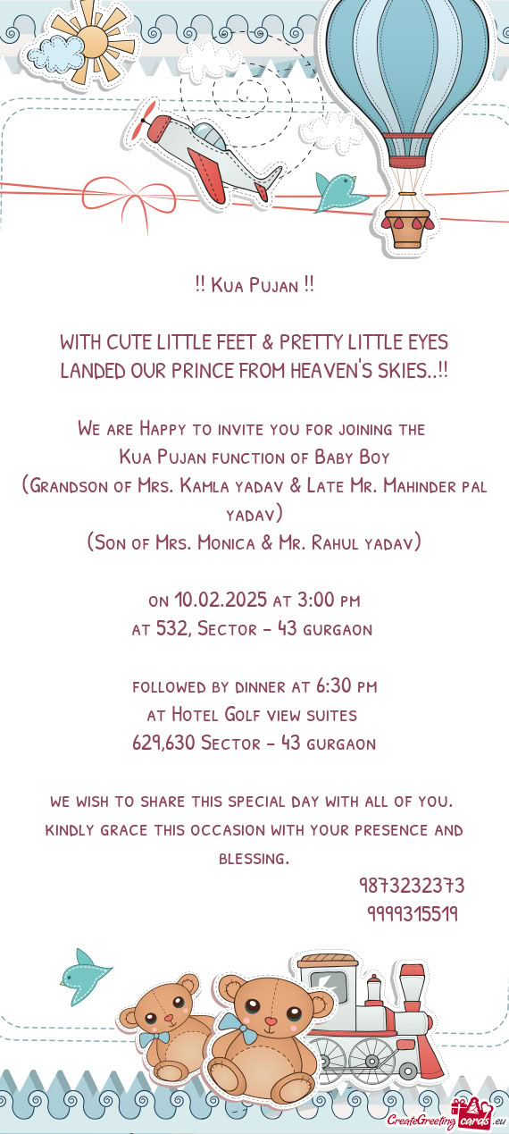 We are happy to invite you for joining the kua pujan function of our beloved little babies