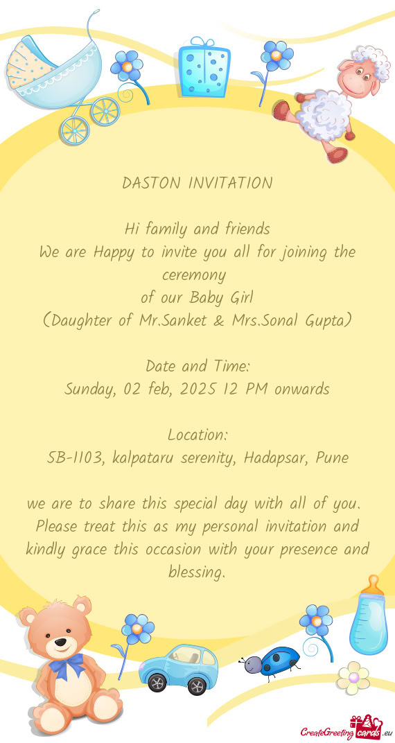 Abubakar, Ibrahim and Essa are pleased to announce the arrival of their little brother MUHAMMAD ISMAIt gives us immense pleasure to invite you and your family to the Jhand Ceremony of our son MuhammadWe are Happy to invite you for the welcome party Of my baby girlTtle Prince CharmingShri Shyam MandirOuld be glad with your gracious presence to make the occassion more memorable