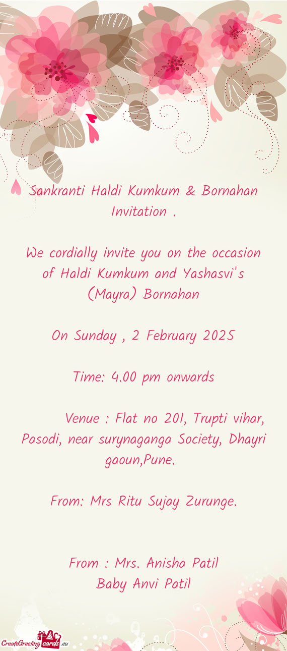 We cordially invite you and your kids on the occasion of our daughters Bornahan