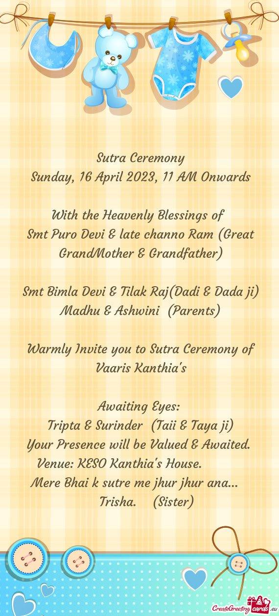 With immense pleasure we invite you and your family to our son's first head tonsure & ear piercing ceremony